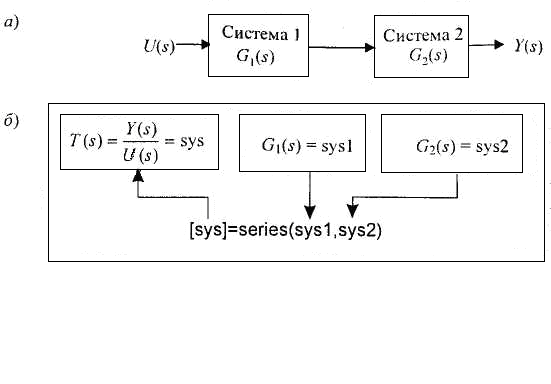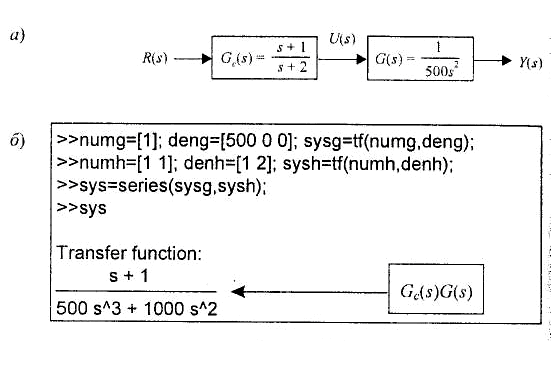 Рассмотрим пример последовательного соединения Элементов. Пусть объект управления задан передаточной функцией G(s) = 1/500s2, а регулятор имеет передаточную функцию Gc(s) = (s + 1)/(s + 2). На рис. 1.41 изображено последовательное соединение двух систем с передаточными функциями G1(s) и G2(s), а также проиллюстрирован смысл функции series (последовательное соединение), а на рис. 1.38 показано, как с ее помощью определяется произведение Gc(s)G(s). Результирующая передаточная функция имеет вид