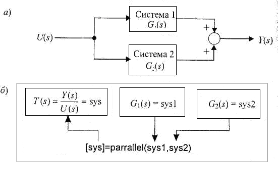 В структурных схемах очень часто встречается параллельное соединение элементов. В таких случаях для определения передаточной функции соединения используется функция parallel. Смысл этой функции поясняет рис. 1.43.