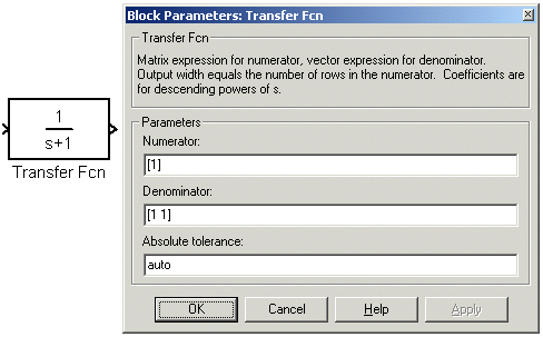2. Блок передаточной функции Transfer Fcn (из библиотеки Continuous – аналоговые блоки).