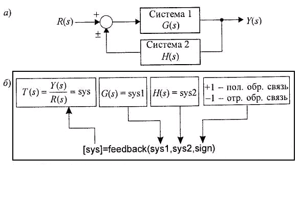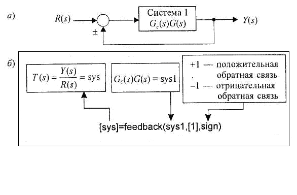 На рис. 1.46 изображена система с неединичной обратной связью и проиллюстрировано применение к ней функции freedback. Если в аргументах этой функции не указан знак обратной связи sign, то по умолчанию она предполагается отрицательной.