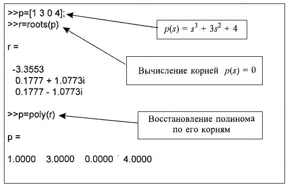 Если р есть вектор-строка, состоящая из коэффициентов p(s) в порядке убывания степеней, то функция roots(p) определяет вектор-столбец, содержащий корни этого полинома.