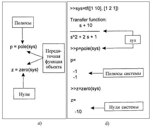 Рис. 1.39. (а) Функции pole и zero; (б) Применение функций pole и zero для вычисления полюсов и нуля линейной системы