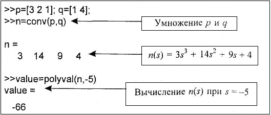 Поскольку передаточная функция имеет вид отношения двух полиномов, мы сначала рассмотрим, как MATLAB оперирует с алгебраическими полиномами. При этом не будем забывать, что в передаточной функции должны быть заданы оба полинома – и в числителе, и в знаменателе.