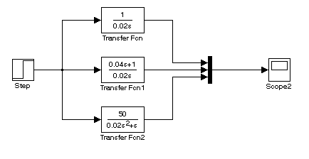 Для моделирования переходных функций используются три типа блоков. Первый – Step этот блок формирует единичный импульс. Второй – Transfer Fсn задаёт передаточную функцию звена. Третий – Scope осциллограф, выводящий график переходной функции. Если сигналов несколько, как при пропорционально-интегральном, то используется ещё блок - Mux.