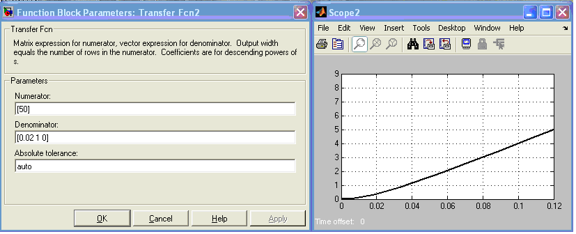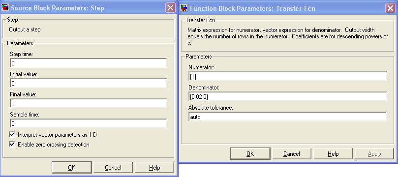 Рис.3.5 Параметры блоков Step и Transfer Fcn идеального