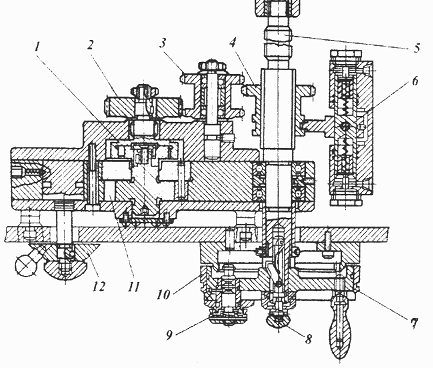 Автоматическая поперечная подача крестового суппорта включается в конце каждого продольного хода стола. От лопастного гидроцилиндра 11 через обгонную муфту 1, зубчатые колеса 2, 4 или при реверсировании 2, 3, 4 движение сообщается ходовому винту 5. Величина подачи устанавливается поворотом лимба 12, который управляет величиной угла поворота лопасти гидроцилиндра 11. Золотник 6 выполняет реверсирование подачи суппорта, вводя в зацепление шестерню 4 с колесами 2 или 3.