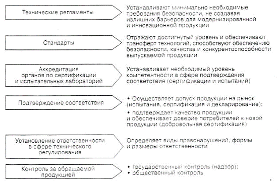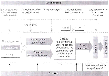 Государство возлагает на себя ответственность по организации системы подтверждения соответствия продукции установленным в техническом регламенте требованиям. Инструментом этой деятельности является аккредитация участников оценки (подтверждения) соответствия. Непосредственно работы по оценке (подтверждению) соответствия выполняют аккредитованные органы по сертификации, испытательные лаборатории (центры). При этом законодательно установлена невозможность совмещения деятельности по аккредитации и подтверждению соответствия. В рамках процедур оценки (подтверждения) соответствия осуществляется контроль (оценка) продукции и подтверждается возможность вывода ее на рынок. Только продукция, соответствующая установленным требованиям, допускается на рынок с выдачей сертификата соответствия или регистрацией декларации о соответствии. В некоторых случаях (если это предусмотрено техническим регламентом) документом, позволяющим вывести продукцию на рынок, является свидетельство о ее государственной регистрации.