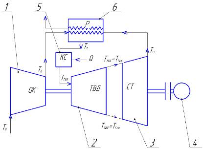 Тепловая схема ГТУ приведена на рисунке 1. Воздух из атмосферы поступает в осевой компрессор 1 через воздухозаборное устройство. В компрессоре воздух сжимается, подается в регенератор 6, где подогревается уходящими газами. Подогретый воздух поступает в камеру сгорания 5, туда же подается природный газ (топливо), часть воздуха участвует в процессе горения, остальной смешивается с продуктами сгорания, образуя рабочее тело. Рабочее тело из камеры сгорания поступает в турбину высокого давления (ТВД) 2. Тепловая энергия рабочего тела преобразуется в механическую энергию вращения, которая расходуется на привод осевого компрессора.
