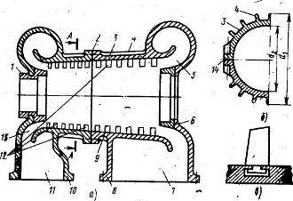 ребро жесткости, 5 - кольцевой канал, 7, 11 - входной в выхлопной патрубки, 8,