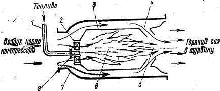 зона смешения, 6 - зона горения, 7 - корпус, 8 - топливораздающее устройство