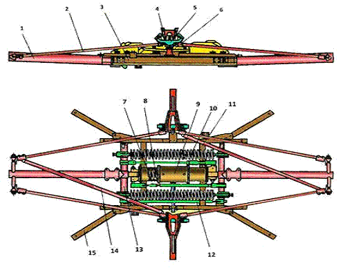 - нижняя подвижная рама; 2 - верхняя рама; 3 - боковина; 4 - скоба; 5 каретка; 6 - полоз; 7 - рычажный механизм; 8 - опускающая пружина; 9 - цилиндр; 10 - подъемная пружина; 11 - поперечина; 12 - тяга; 13 - поворотный вал; 14 - диагональная распорка; 15 - основания.
