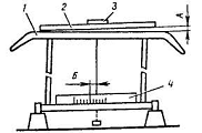 Проверка перекосов рам и полоза токоприемника проверяют линейкой 2 длиной 1м с уровнем 3 посредине. Отклонение рабочей поверхности полоза от горизонтали определяется зазором А между рабочей поверхностью полоза и концом контрольной рейки, который не должен превышать 5мм. Боковое смещение полоза Б относительно основания определяется по отвесу, закрепленному в центре полоза.