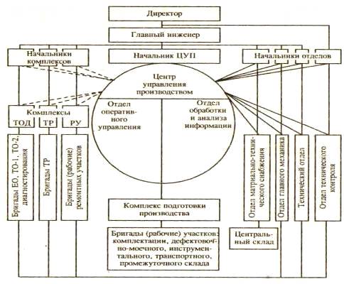 Организационно-производственная структура автотранспортного предприятия значительно зависит от размера, мощности предприятия; вида подвижного состава; оказываемых услуг и др. Структура управления средним автотранспортным предприятием содержит производственно-техническую, экономическую, коммерческую службы; бухгалтерию.