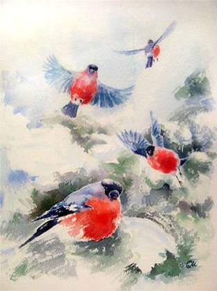 акварели прозрачными мазками (как правило, более темные поверх более светлых),