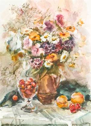 Яркие, свежие лессировочные краски придают акварельным работам особую полнозвучность цвета, легкость, нежность и лучезарность колорита.