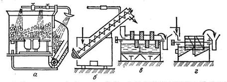 Корнеклубнемойки по конструкции рабочих органов делятся на дисковые, шнековые, кулачковые и барабанные (рис.1). Во всех корнеклубнемойках процесс очистки корней и клубней от земли и других примесей происходит в воде за счет трения клубней друг о друга и о рабочие органы машины. Грязь и примеси удаляются потоком воды.