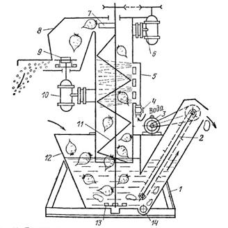 измельчителя, 9 - измельчитель, 11 - шнековая мойка, 12 - моечная ванна, 13 -