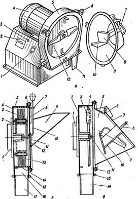 б - приставка для дробления зерна: 1 - переходной фланец; 2 - молотковый ротор; 3, 13 - молотки; 4-корпус приставки; 5 - стопор решета; 6 - уплотнение крышки корпуса; 7- фиксатор; 8 - съемная крышка; 9 - загрузочный буикер зериа; 10 - устройство регулировки подачи зерна; 11 - крепление ротора; 12 - загрузочное окно; 14 - чрех-секционное решето; 15 - кольцо; 16 - выгрузная горловина; 17 - лоток;