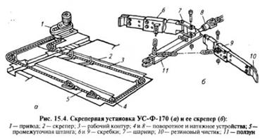 На фермах крупного рогатого скота и свиноводческих широко используют скребковые транспортеры кругового и возвратно-поступательного движения скребков, а также скреперные установки с возвратно-поступательным движением скребков (штанговые).