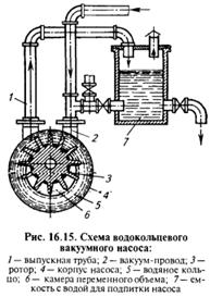 В водокольцевом насосе ячеистый ротор 3 (рис. 14) размещен в рабочей камере эксцентрично, поэтому при работе ротора в камере образуется вращающееся кольцо воды, а между ним и ротором возникает воздушное пространство серповидного сечения с переменным объемом камер, образуемых стенками ячеек ротора и водяным кольцом. Работа ротора аналогична действию камер переменных объемов ротационного вакуумного насоса. С приближением камеры переменного объема к всасывающему окну вакуум-провода 2 происходит всасывание воздуха из системы с его последующим сжатием при вращении ротора и выпуске в окно трубы 1.