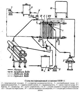 Рис.15.Схема пастеризационной установки ОПФ-1: 1-пластинчатый