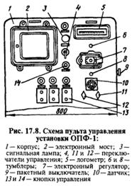 Рис.18. Схема пульта управления установки ОПФ-1: 1-корпус;2-электронный мост; 3-сигнальная лампа; 4,11 и 12 -переключатели управления; 5-логометр; 6 и 8-тумблеры; 7- электронный регулятор; 9-пакетный выключатель; 10-датчик; 13 и 14-кнопки управления