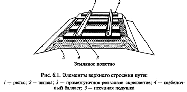 Верхнее строение пути служит для направления движения подвижного состава, восприятия силовых воздействий от его колес и передачи их на нижнее строение. Верхнее строение пути представляет собой комплексную конструкцию, включающую балластный слой, шпалы, рельсы и рельсовые скрепления, противоугоны, стрелочные переводы, мостовые и переводные брусья. Рельсы, соединенные со шпалами, образуют рельсошпальную (путевую) решетку. При этом шпалы заглубляются в балластный слой, укладываемый на основную, площадку земляного полотна. Типы верхнего строения пути: