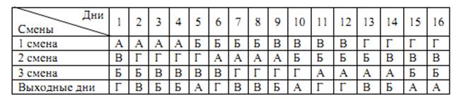работе (4 бригады: А, Б, В, Г, Тсм - 8 час., период сменооборота 16 дней)