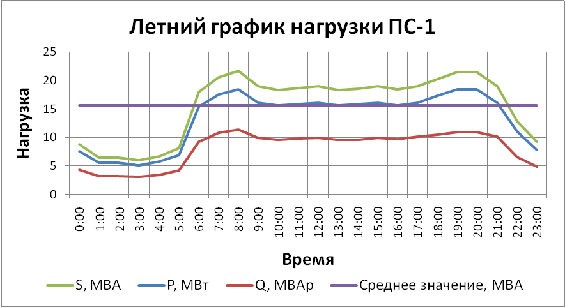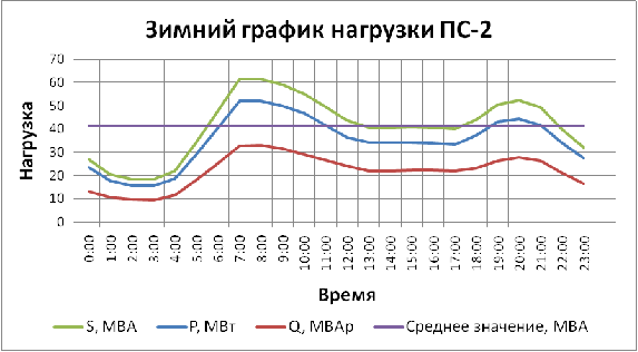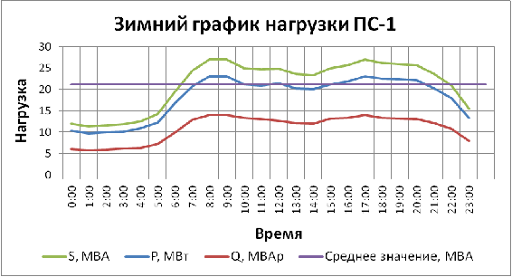 Рис. 5.1.1. Графики полной, активной, реактивной и средней мощностей характерного зимнего дня.