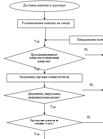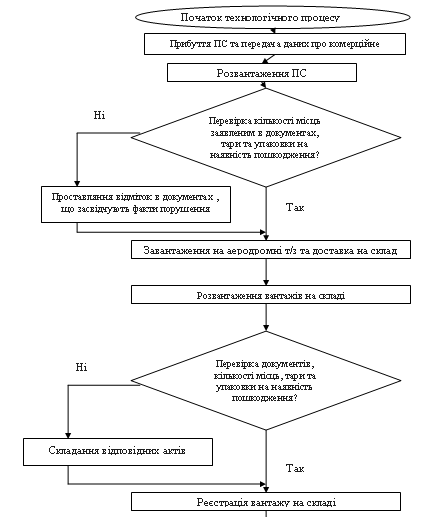 Диспетчер оперативної групи отримує повідомлення про прибуття ПС. Дані містять всю необхідну інформацію. Після прибуття ПС диспетчер отримує дані про посадку ПС і номер і місце стоянки, час прибуття і кількість вантажу. Потім проводять підготовку до розвантаження ПС, розраховуючи необхідну кількість транспортних засобів. Далі дані передаються командиру вантажників, який доставляє вантажників до ПС. Розвантаження проходить в присутності екіпажу, при потребі - супроводжуючої особи. Прибувши до місця стоянки ПС, вантажник одержує супровідні документи (AWB, CM) на вантаж. При вивантаженні з ПС вантажниками СНОПС, вантажник СПВО контролює стан, цілісність упакування та кількість вантажу згідно документів. При виявленні невідповідності кількості вантажу супровідним документом або ушкодження вантажу, вантажником СПВО робиться відповідний запис в СМ, що завіряється підписом представника АК і печаткою співробітника митниці. Ушкоджені місця пред’являються співробітнику САБ, що забезпечує супровід вантажу до складу СПВО.