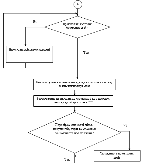 Завантаження рейсу на авіатранспорт. За 2 години до вильоту агент вносить до вантажного маніфесту необхідні дані щодо рейсу. Агент повідомляє диспетчеру центру оперативного контролю авіакомпанії кінцевий тоннаж вантажу і узгоджує з ним також в які вантажні відсіки ПС у відповідності із центруванням повинен бути завантажений вантаж. За 1,5 години до вильоту починається завантаження заброньованого на цей рейс вантажу. Перед завантаженням вантажу на ПС, він підлягає перевірці. Він транспортується і закріплюється в середині ПС. Вся необхідна документація передається екіпажу ПС і ставиться підпис представника АК про прийняття вантажу на ПС. Цей вантаж списується зі складу.