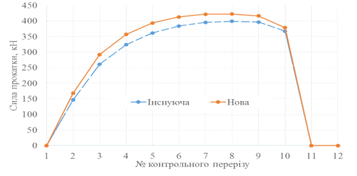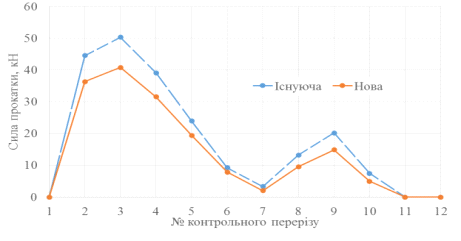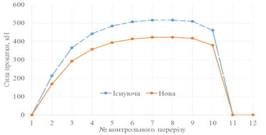 повної сили при прямому ході кліті при існуючій і новій схемі представлено на