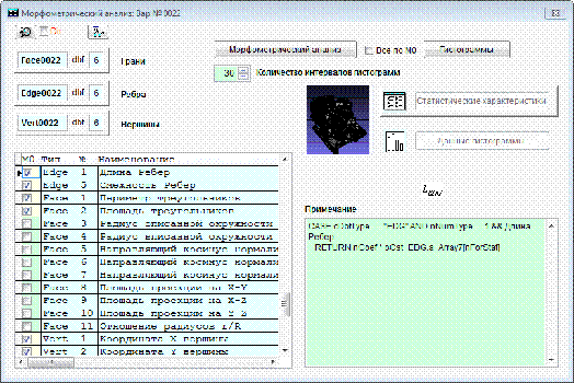 морфометрический анализ модели (определение характеристик для вершин, ребер, граней составляющих треугольников и их статистический анализ);