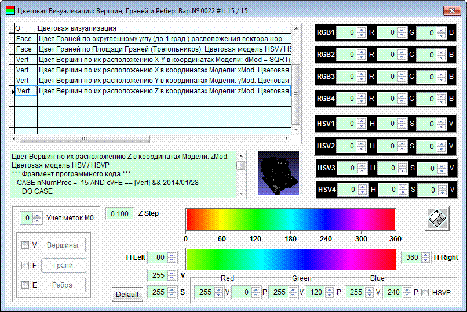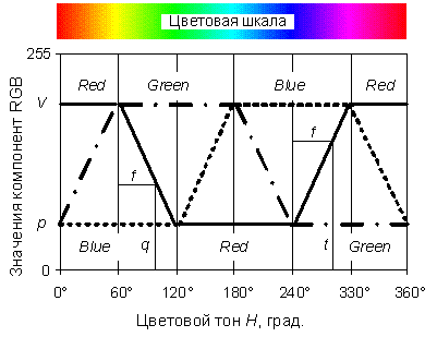 Общий алгоритм перехода HSV Þ RGB представлен в [7]. Для случая H = 0÷360°; S, V, R, G, B = 0÷255 расчет выполняется по следующим зависимостям в два этапа (определение вспомогательных переменных и непосредственно компонент RGB).
