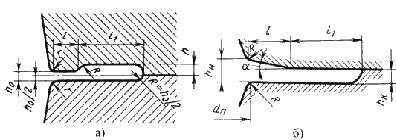 Размеры облойной канавки (рис.11, а) назначаются в зависимости от сложности поковки и ее размеров в плане. Клиновая облойная канавка (рис. 11, б) позволяет снизить потери на облой в результате повышения сопротивления течению металла.