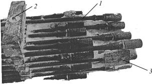 Рис. 1.45. Внешний вид штанг насосных ШН22 (класс Д, номер сертификата ЦЗЛ 1155) при наличии консервационного покрытия тела, ниппеля, головки штанги (патент РФ № 2255102): 1 – штанга насосная ШН22 (концевой участок с муфтами); 2 – фрагмент упаковки; 3 – пластина с краткой характеристикой пакета штанг (ООО «ПермНИПИнефть», консервационный состав