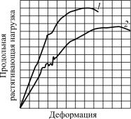 На рис. 2.18 представлены кривые «усилие – деформация» штанг, имеющих однородную 1 и неоднородную 2 полосчатую ферритно-сорбитную структуру. Пользуясь этими кривыми какэта-