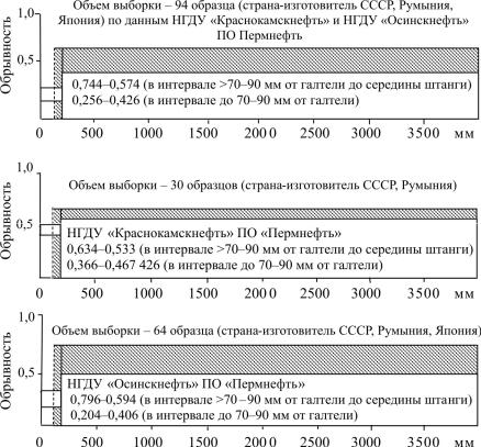 Для установления закономерности распределения обрывов по длине штанги проанализированы 94 образца за период 1986–1987 гг. в ПО «Пермнефть». Распределение обрывов показано на рис. 3.2, из которого следует, что в интервале 70–90 мм от галтели до середины штанги лежит 0,744–0,574 всех обрывов, а в интервале до 70–90 мм от галтели – 0,266–0,426 всех обрывов.