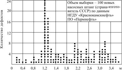 Следовательно, наиболее характерным обрывом штанги является коррозионно-усталостное разрушение в различных ее частях. Причем в зависимости от наличия или отсутствия дефекта процесс накопления усталостных повреждений материала штанги имеет различную длительность в диапазоне от 0,2 до 20 млн циклов (статистика отказов: 94 штанги за период 1986–1987 гг). Это подтверждается наличием и характером распределений дефектов по длине новой насосной штанги, представленной на рис. 3.4 (данные НГДУ «Краснокамскнефть»).