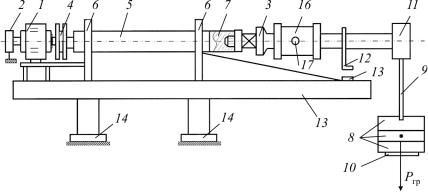Рис. 3.5. Стенд ИКШ-25 для испытания насосных штанг на коррозионноусталостную прочность: 1 – электродвигатель; 2 – счетчик числа оборотов образца; 3 – испытуемый натуральный образец; 4 – втулочно-кольцевая муфта; 5 – вал; 6 – стойки; 7 – переводник; 8 – грузы; 9 – шток системы нагружения; 10 – тарель; 11 – шарнирная головка; 12 – рычаг автоматической остановки двигателя; 13 – конечный выключатель; 14 – рама; 15 – амортизационные подушки; 16 – коррозионная ячейка;