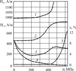Рис. 3.11. Зависимость коэрцитивной силы Нс итангенциальнойсоставляющейнапряженностиполяНτ остаточно намагниченного образца из стали 20Н2М отвеличины действовавшихнапряжений: 1 – Нс; 2 – Нτσ; 3 – Нτ; 4 – зависимость Нτσ отвеличины действующих напряжений; 5 – кривая зависимости напряжение –