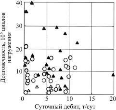 Рис. 1.2. Показателидолговечности насосныхштанг взависимости от суточного дебита скважины и технологии ее изготовления: { – насосная штанга, изготовитель Очёрский машзавод (г. Очёр), сталь 20Н2М, режим термообработки нормализация (старый цех); U – насосная штанга, изготовитель Очёрский машзавод (г. Очёр), сталь 20Н2М, режим термообработки нормализация (новый цех); S – насосная штанга, изготовитель машзавод им. В.И. Ленина (г. Пермь), сталь 15Х2НМФ, режим термообработки закалка
