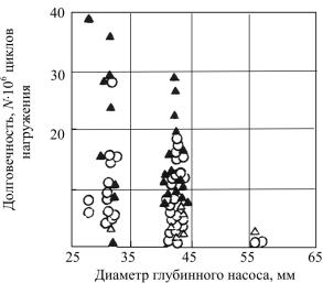 Рис. 1.3. Показатели долговечности насосных штанг взависимости отдиаметра глубинного насоса плунжерного типа и технологии их изготовления: