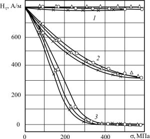Рис. 3.12. Зависимость тангенциальной составляющей магнитного поля Нτ пластически деформированныхобразцов всостоянии поставкиотвеличины прикладываемых напряжений: