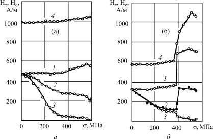 Рис. 3.13. Зависимость коэрцитивной силы Нс и тангенциальной составляющей магнитного поля Нτ от величины прикладываемой нагрузки для стали 20Н2М: а – образцы, вырезанные из работающей насосной штанги; б – после пластической деформации 12 % и отжига при 960 ° С (1 ч, вакуум); 1 – Нτ0; 2 – Нτ; 3 – Нτσ; 4 – Нс