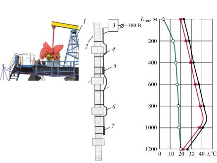 месторождений, эксплуатируемой механизированным способом (УСШН), НКТ 2,5" без теплоизоляции с протяженным источником тепловой энергии: 1 – станок-качалка УСШН; 2 – насосно-компрессорные трубы (НКТ); 3 – станция управления источником тепловой энергии;