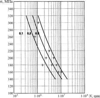 Исходя из геометрии кривых, представленных на рис. П.1.6, и величины средневероятностного значения ограниченного предела выносливости равного 143 МПа, установленного по результатам усталостных испытаний фрагментов и с учетом принятого коэффициента запаса по надежности изделия от 1,46 до 1,62, величина допустимого приведенного напряжения для штанг, изготовленных из стали 20ХГН1М, не должна превышать следующие значения: