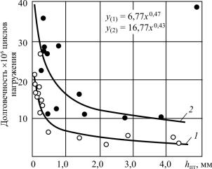 Рис. 1.17. Зависимость долговечности насосных штангот величины слояспониженнойтвердостью(hпт): 1 – насоснаяштанга, изготовитель Очёрский машзавод, г. Очёр, сталь20Н2М, режимтермообработки нормализация; 2 – насосная штанга, изготовительмашзавод