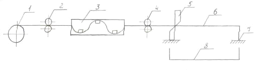 барабан; 4 - тянущие ролики; 5 - нож для резки стержней; 6 - кондуктор; 7 -