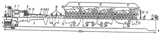 Рисунок 15. Схема плоскосеточной бумагоделательной машины: 1 - машинный бассейн; 2 - насос; 3 - бак постоянного напора; 4 - коническая мельница; 5 - смесительный насос; 6 - задвижка; 7 - очистная аппаратура; 8 - напорный ящик; 9 - сеточная часть; 10 - грудной вал; 11 - гауч-вал; 12 - регистровые валки; 13 - отсасывающие ящики; 14 - решительный валик (эгутёр); /5 - правильный валик; 16 - прессовая часть; 17 - прессовые валы; 18 - шерстяные сукна; 19 - сушильная часть; 20 я 21 - сушильные цилиндры; 22 - каландр; 23 - холодильные цилиндры; 24 - накат; 25 - продольно-разрезный станок *